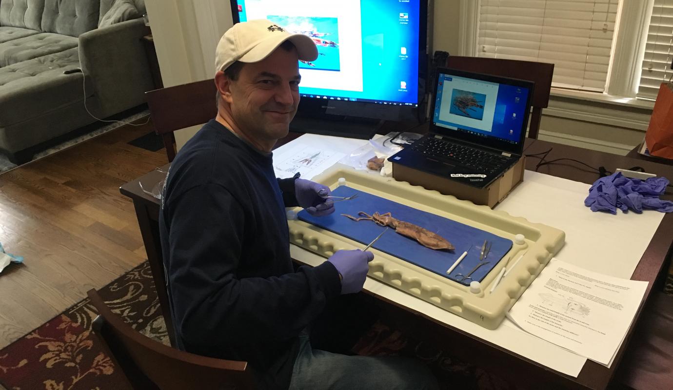 Head of School Dr. Jeff Terwin kicked off Cephalopod Week in his marine biology class with a special activity for students to better understand biodiversity. He assembled a bundle of cephalopod treasures for each individual student, including everything they would need for an in-home dissection. Then over Zoom, Terwin guided the class through an in-depth analysis of squid adaptations. Students were also provided with delicious breaded calamari as they learned how squid are harvested and the cephalopods’ critical importance to the ocean ecosystem.
