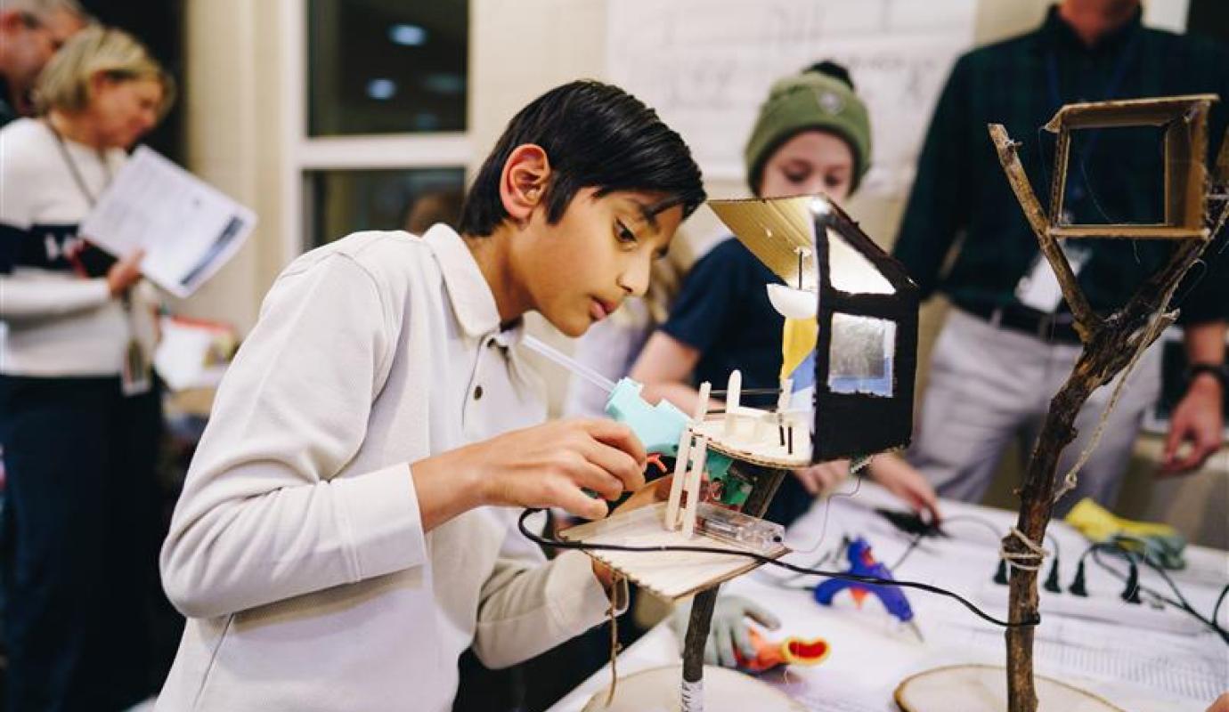 That research came to life through projects like Rowe Apfelstadt ’34’s two-story treehouse design, complete with a popsicle-stick fishing dock, working pulley system, and greenhouse-style upper level with a skylight. Her project blended imagination with principles of balance and engineering. Nearby, Jackson Remley ’28 described how he and his peers used rolls of chicken wire to construct a massive brain prop for the upper school’s upcoming production of “A Wrinkle in Time.” Through teamwork, trial, and a few 48-foot rolls of wire, the group found creative ways to turn an abstract idea into a physical structure. “Theatre tech has so many parts,” said Jackson. “Some people like lighting or sound, but I really love building props because you get to see the whole show come together.”
