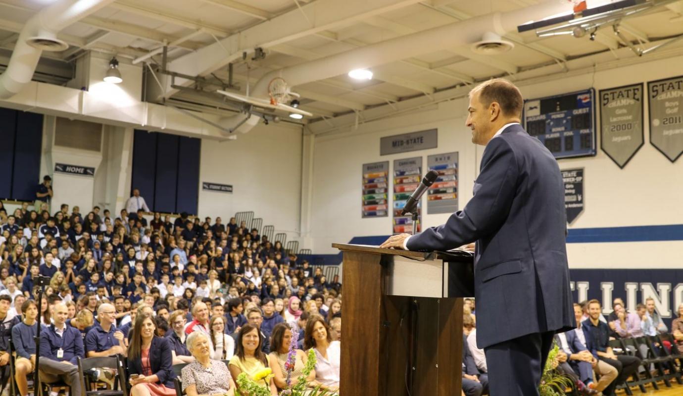 The first Monday after classes began marked two special occasions in Wellington history. Dr. Jeff Terwin was officially inducted as the 6th head of school. In his address to the entire student body, faculty members, and honored guests, Dr. Terwin expressed his gratitude and humility in taking on this new venture. He also reflected on Wellington’s founding mission to challenge the traditional, standardized education model.