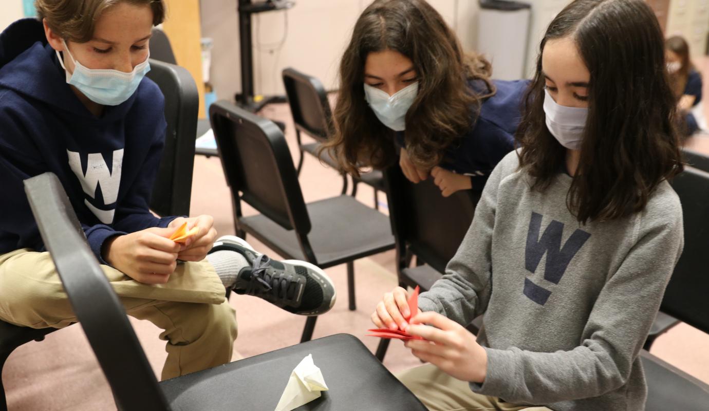 In choir, 5th and 6th graders recently began learning “A Song of Peace” by Teresa Jennings, based on the ancient Japanese legend that promises anyone who folds a thousand origami cranes will be granted a wish by the gods. Middle School Vocal Music Director Lisa Springer thought the students’ experience could be enhanced by making their own paper cranes to be used as a backdrop for their upcoming spring performance. In researching the project, Springer discovered the cranes can be sent to the Children’s Peace Monument in Peace Memorial Park, in Hiroshima, built to commemorate Sadako Sasaki and the thousands of other innocent children who died due to the atomic bombing of the city on August 6, 1945. Exposed to radiation by the blast at a young age, Sadako died ten years later from leukemia. During her long illness, she folded paper cranes. To this day, folded paper cranes from around the world are sent to the monument, symbolizing our continual quest for peace.