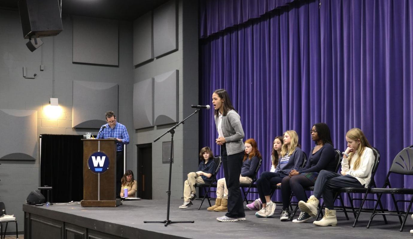 Before the big day, students participate in practice sessions to familiarize themselves with rules and procedures, creating an environment where they can thrive. When the competition arrives, the atmosphere is electric. Words like “melancholy,” “bibliophile,” and “contribute” echo in the Blanchard Performing Arts Center as students demonstrate poise, focus, and mastery.
