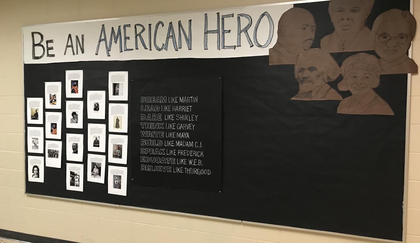 Explorers of the World classes in middle school researched topics centered around the people and significant events of African American history, ranging from poet Langston Hughes to Mae C. Jemison, the first black woman to travel into space. Advisory groups collaborated on researching notable people of color and then decorating classroom doors with powerful imagery of what they learned.