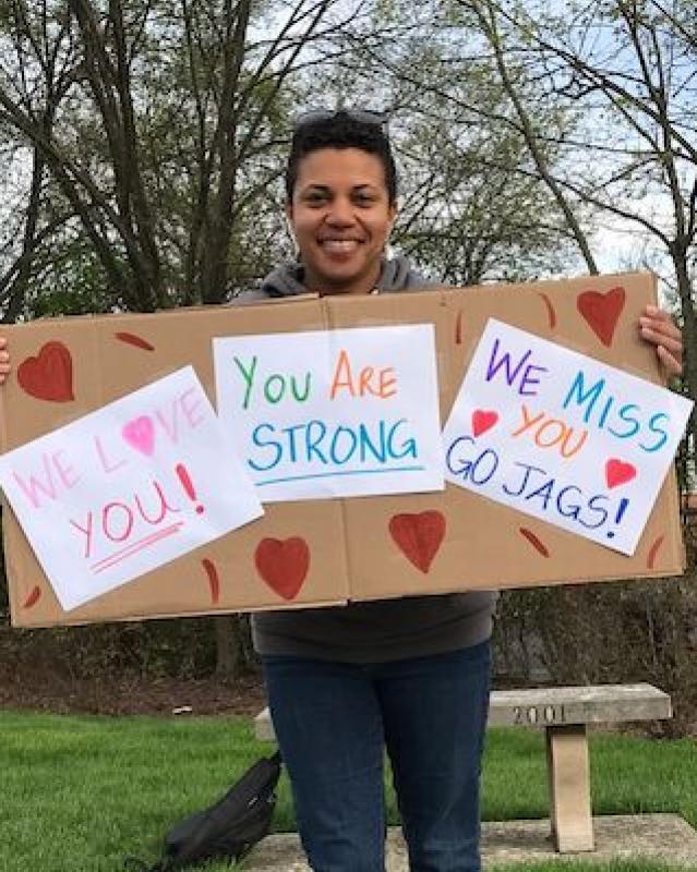 Even while apart, in the first few months of COVID-19 imposed social isolation, Jags stayed connected in creative, meaningful ways, showing how deeply they cared for each other. Head of School Dr. Jeff Terwin, with the help of quaranteammate Duke the Jaguar, made special deliveries to students in need of essential learning supplies. Faculty made heartfelt videos about how much they missed their classes and also drove by students’ homes to give them a reassuring wave from the car window or throw a socially distant surprise party in the driveway. Sharla Starker P ’17 ’22, lower school teacher, guided 5-year- olds through meditation and breathing exercises while also hosting weekly parent support meetings. Jaime Bennati, upper school art teacher, created a huge sidewalk chalk mural to encourage seniors to “just keep swimming” when they sometimes felt disappointed or frustrated. Pete Collopy, sports performance coach, hosted workouts on Instagram, and Wellington alumna Ashley Koff ’91, a registered dietician, led a Facebook live chat about navigating health and wellness from home.